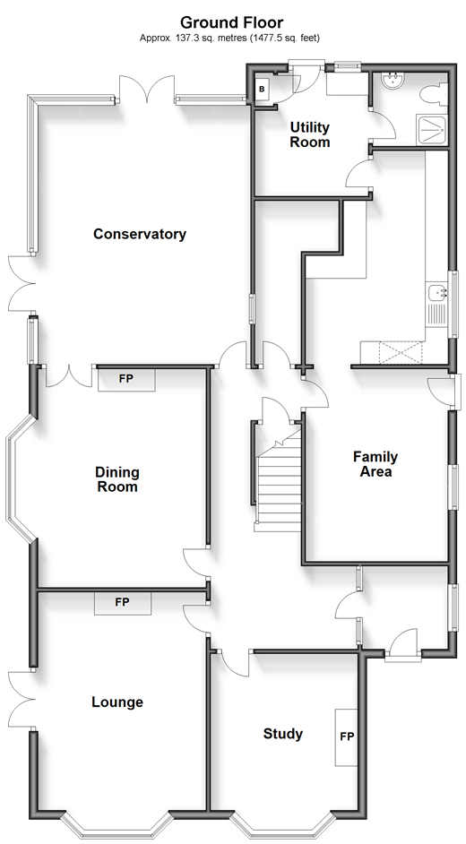 Room sizes:PorchHallStudy: 13'9 x 10'4 (4.19m x 3.15m)Lounge: 15'8 x 12'2 (4.78m x 3.71m)Dining Room: 15'8 x 14'10 (4.78m x 4.52m)Conservatory: 19'1 x 15'9 (5.82m x 4.80m)Utility Room: 9'1 x 8'0 (2.77m x 2.44m)Shower RoomKitchen: 15'5 x 10'5 (4.70m x 3.18m)Family Area: 14'1 x 10'3 (4.30m x 3.13m)FIRST FLOORLandingBedroom 2: 14'6 x 12'6 (4.42m x 3.81m)Bedroom 3: 12'6 x 10'4 (3.81m x 3.15m)Separate CloakroomBathroomBedroom 4: 10'1 x 9'3 (3.08m x 2.82m)Bedroom 1: 18'3 x 12'2 (5.57m x 3.71m)OUTSIDERear GardenSide GardenFront GardenGated DrivewayDouble Garage