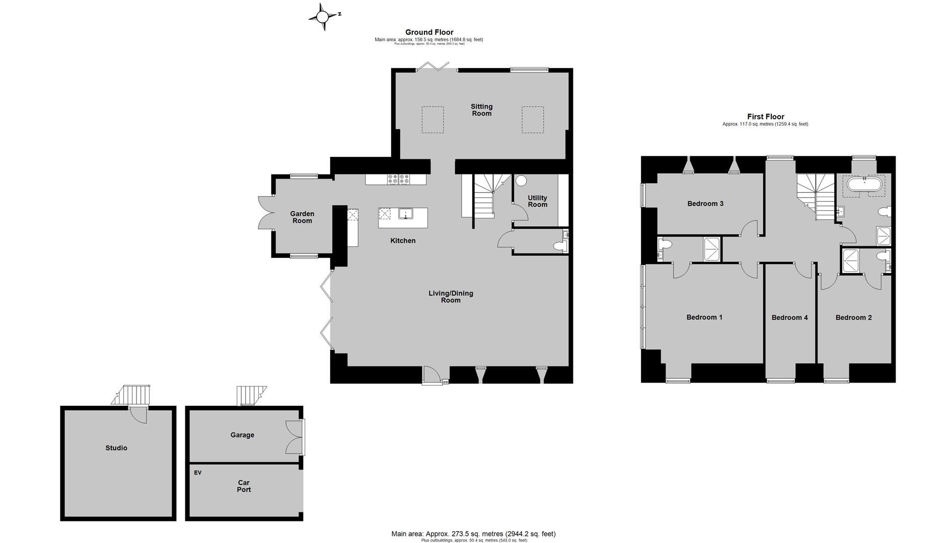The extensive accommodation extends to 2944 sq ft (273 sq m) and is arranged on the ground floor to provide a generous living/dining room, a handmade kitchen, sitting room, garden room, separate utility room and a cloakroom. The first floor comprises four double bedrooms and three bathrooms, including two en-suite shower rooms.