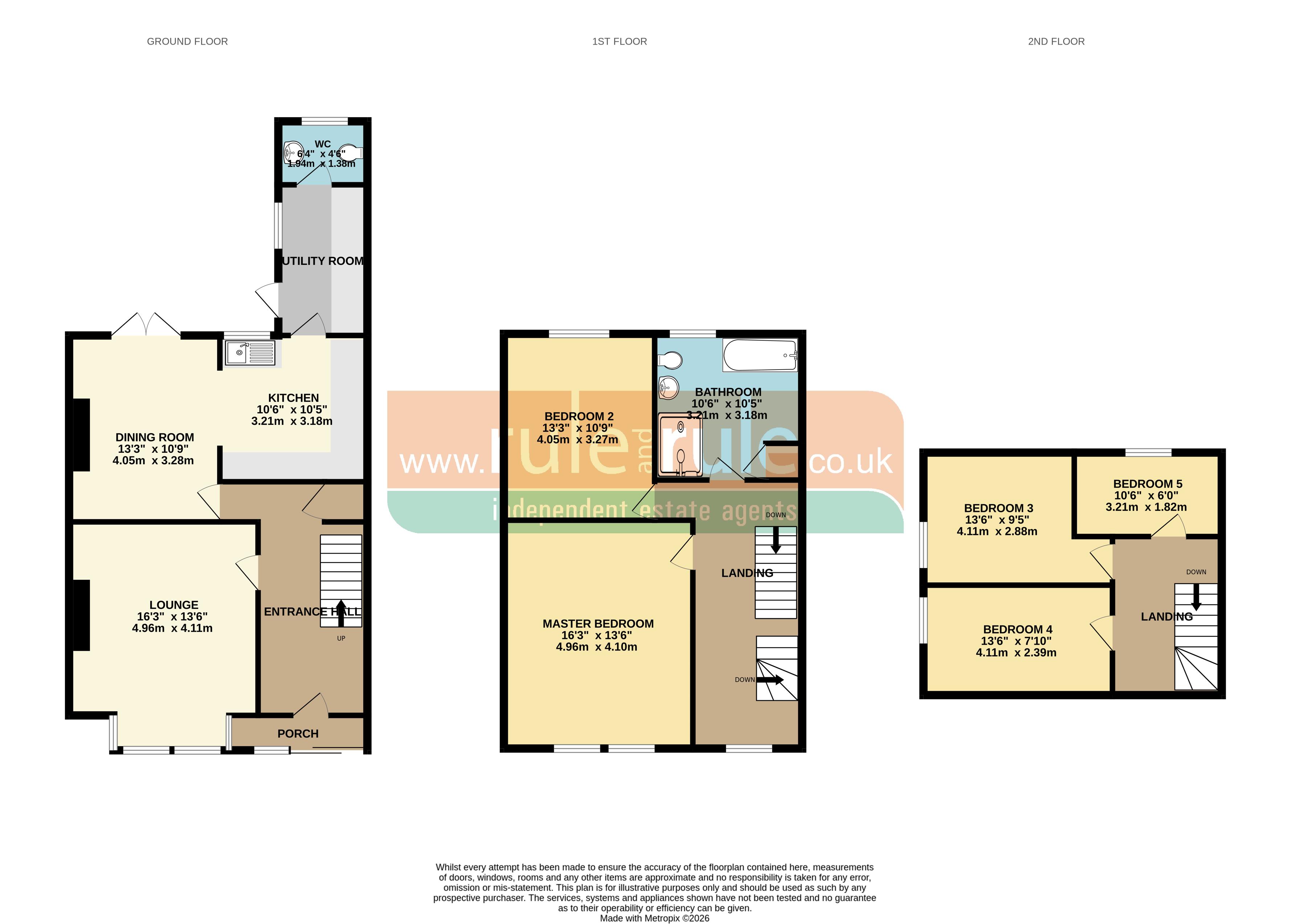The first floor boasts two large double bedrooms and a contemporary bathroom, complete with a separate shower. The second floor comprises three additional bedrooms, offering versatile living space.