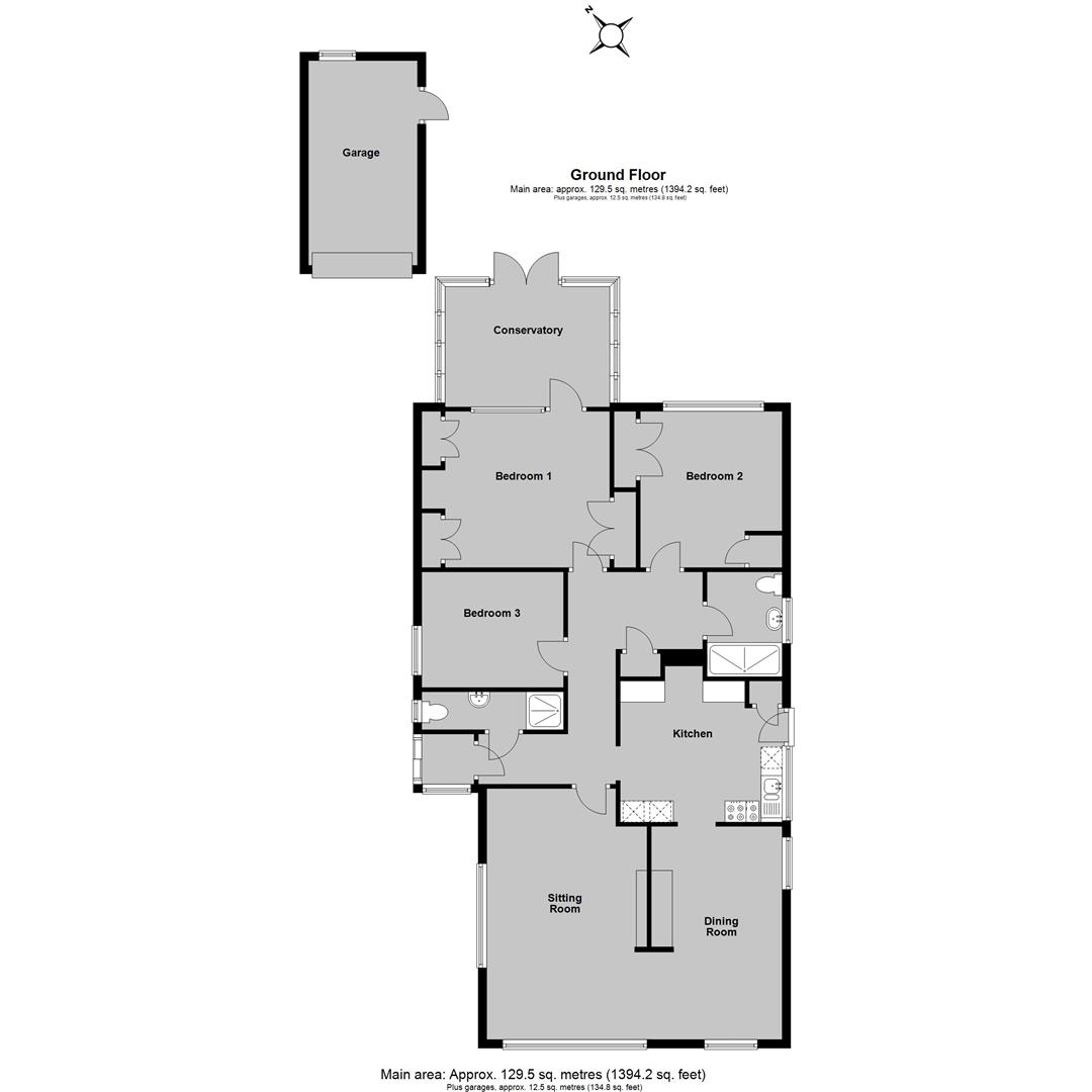 The generously proportioned accommodation extends to 1394 sq ft (129 sq m), would now benefit from a programme of updating and improvement throughout and is arranged on the ground floor to provide an entrance porch, entrance hall, a large sitting room open-plan to a dining room, a kitchen, conservatory, three double bedrooms, and two shower rooms.