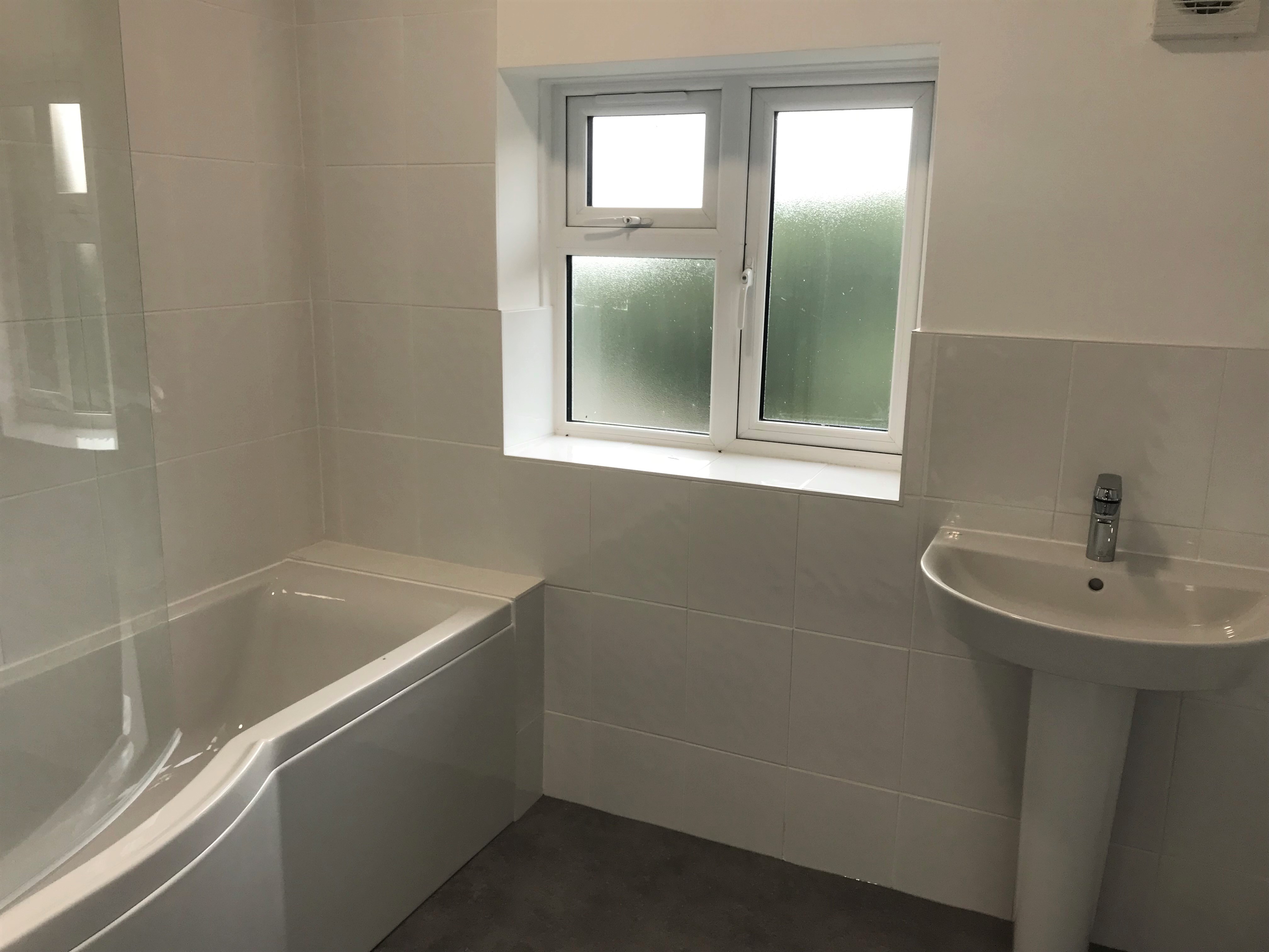 Family bathroom with p-shape bath, Mira shower and screen.