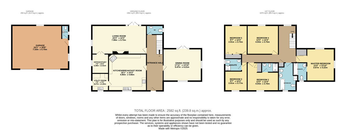 The galleried landing leads onto the first floor accommodation, where you will find 5 double bedrooms, the master having a full ensuite bathroom and two having ensuite shower rooms. All bedrooms offer superb views over the garden and countryside, the master being exceptionally well-lit with its dual aspect windows. The family bathroom benefits from a bath and separate shower cubicle.