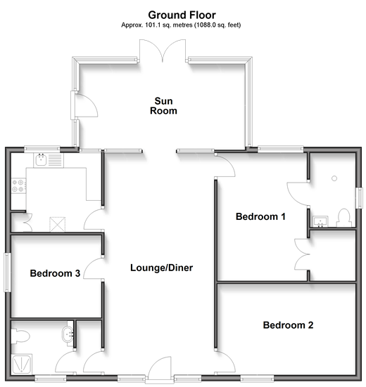Please refer to the footnote regarding the services and appliances. Room sizes:Lounge/Diner: 24'2 x 12'0 (7.37m x 3.66m)Bedroom 2: 15'1 x 10'0 (4.60m x 3.05m)Bedroom 1: 13'10 x 9'10 (4.22m x 3.00m)EnsuiteShower Room: 15'1 x 10'0 (4.60m x 3.05m)Bedroom 3: 9'10 x 8'10 (3.00m x 2.69m)Kitchen: 9'9 x 8'8 (2.97m x 2.64m)Sun Room: 19'3 x 10'0 (5.87m x 3.05m)DrivewayRear GardenFront GardenStorage Shed