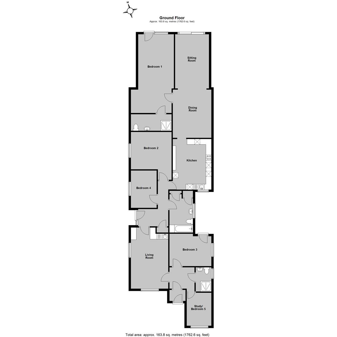 The versatile and deceptively spacious accommodation extends to 1762 sq ft (164 sq m) and is arranged to provide an entrance hall, a generous sitting room open-plan to a dining room, a living room, a kitchen, four bedrooms, a study/fifth bedroom, and three bathrooms including an en-suite shower room to the principal bedroom.