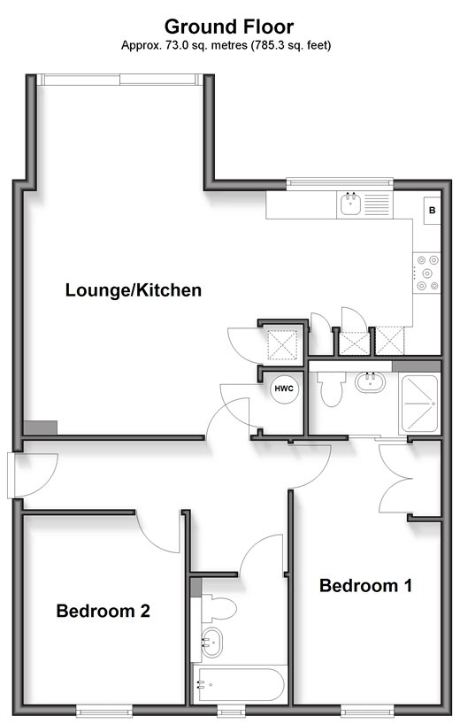 Room sizes:Entrance HallLounge/Kitchen: 24'3 maximum x 20'4 maximum (7.40m x 6.20m)Bedroom 1: 15'4 x 8'7 (4.68m x 2.62m)En Suite Shower RoomBathroomBedroom 2: 11'1 x 9'5 (3.38m x 2.87m)Allocated Parking SpaceVisitors ParkingElectric Car Charging PointsCommunal Garden