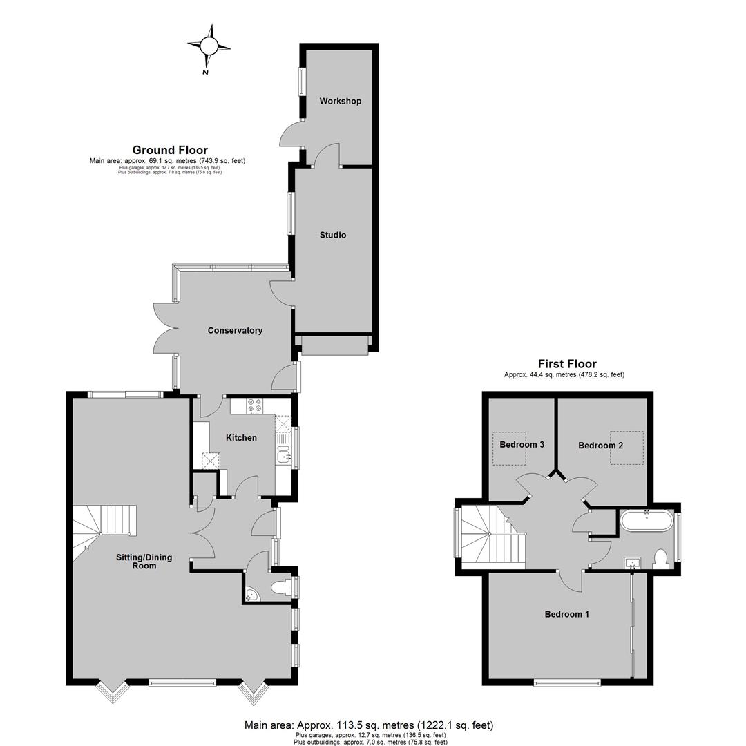 The generously proportioned accommodation is arranged on the ground floor to provide an entrance hall, a large open-plan sitting/dining room with a wood-burning stove and doors leading to the garden, a contemporary kitchen, a conservatory, and a cloakroom. The first floor comprises three bedrooms and a smartly fitted bathroom. The former garage has been converted to create a studio and is suitable for a variety of uses.