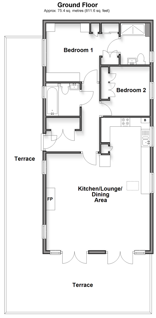 Please refer to the footnote regarding the services and appliances. Room sizes:Entrance HallKitchen/Lounge/Dining Area: 24'11 x 19'0 (7.60m x 5.80m)Bedroom 1: 10'10 x 9'5 (3.30m x 2.87m)Dressing Area: 7'8 x 4'0 (2.34m x 1.22m)En-Suite Shower RoomBedroom 2: 9'3 x 9'3 (2.82m x 2.82m)BathroomTerrace - Front & SideRear Garden