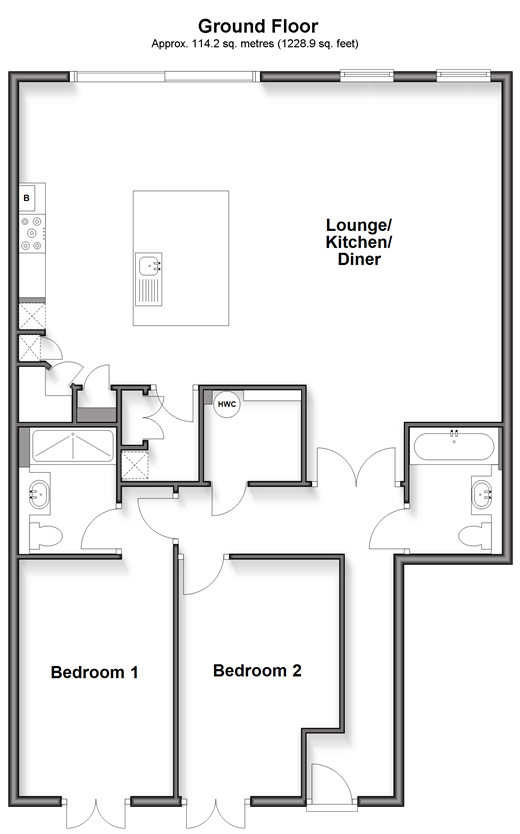 There are also excellent education facilities from nursery up to grammar and private schools, including some rated Outstanding by Ofsted. While, for sporting aficionados, in addition to the golf club, there are a variety of other sports and leisure clubs. Room sizes:Entrance HallBathroomLounge/Kitchen/Diner: 30'4 (9.25m) x 21'1 (6.43m) narrowing to 18'8 (5.69m)Utility RoomMain Bedroom: 14'6 into fitted wardrobes x 9'9 (4.42m x 2.97m)En Suite Shower RoomBedroom 2: 14'7 (4.45m) narrowing to 10'5 (3.18m) x 10'0 (3.05m)Private GardenCommunal GardensAllocated Parking Space
