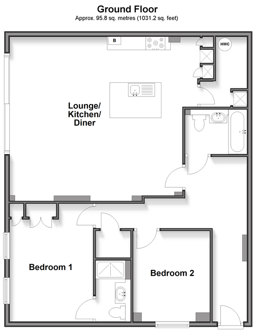 Room sizes:Entrance HallBathroomLounge Kitchen/Diner: 25'3 (7.70m) narrowing to 21'5 (6.53m) x 19'8 (6.00m)Utility RoomMain Bedroom: 14'6 into fitted wardrobes x 9'7 (4.42m x 2.92m)En Suite Shower RoomBedroom 2: 11'5 x 9'5 (3.48m x 2.87m)Private GardenCommunal GardenAllocated Parking Space