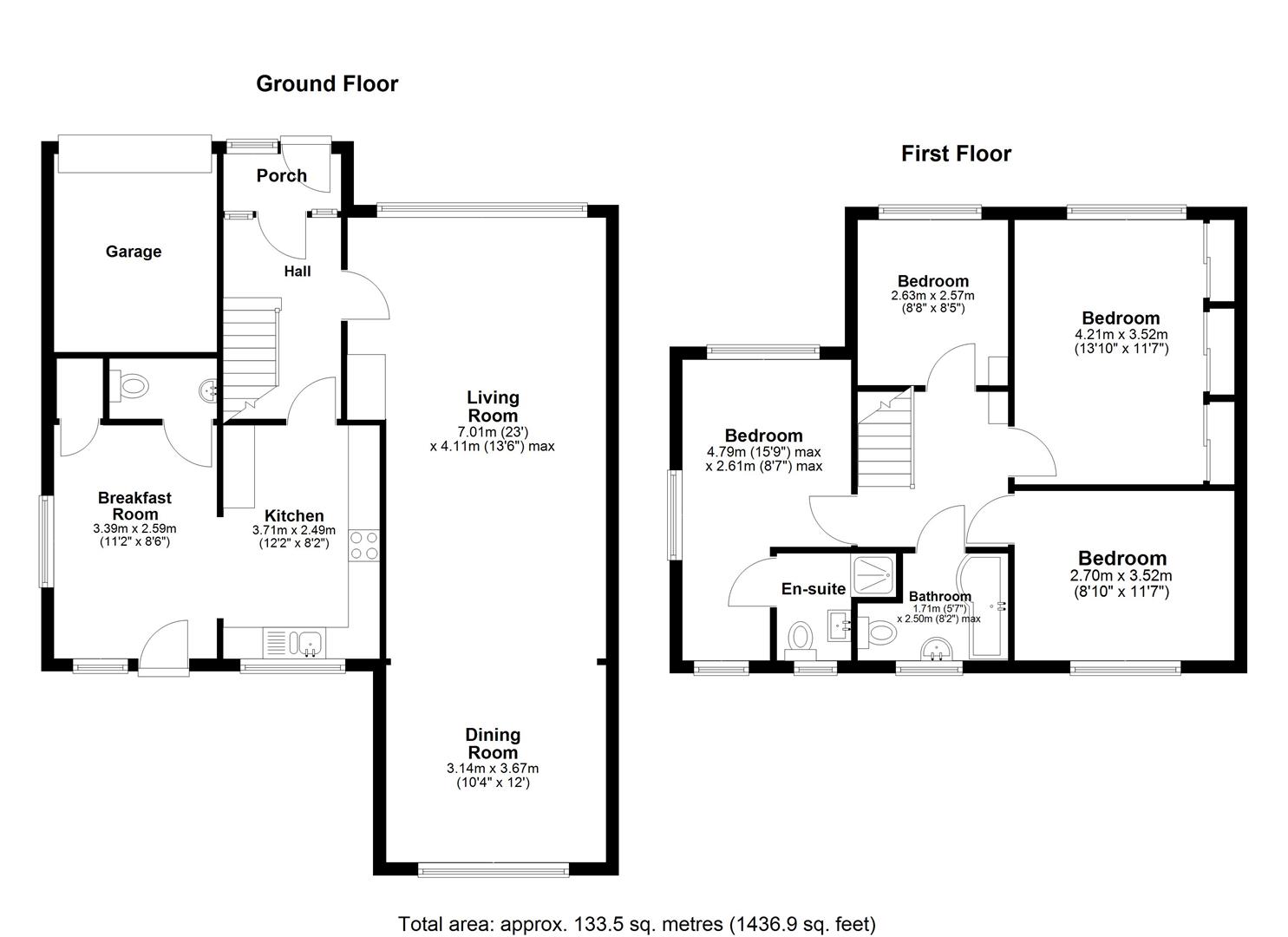 The ground floor opens with an entrance hall leading to a light and airy lounge, which flows into a dining area overlooking the garden. The kitchen is complemented by a snug seating or breakfast area, creating a versatile everyday space, with a useful utility cupboard completing the layout. Upstairs, there are four well-sized bedrooms, with the main bedroom benefiting from an ensuite shower room, in addition to the family bathroom.