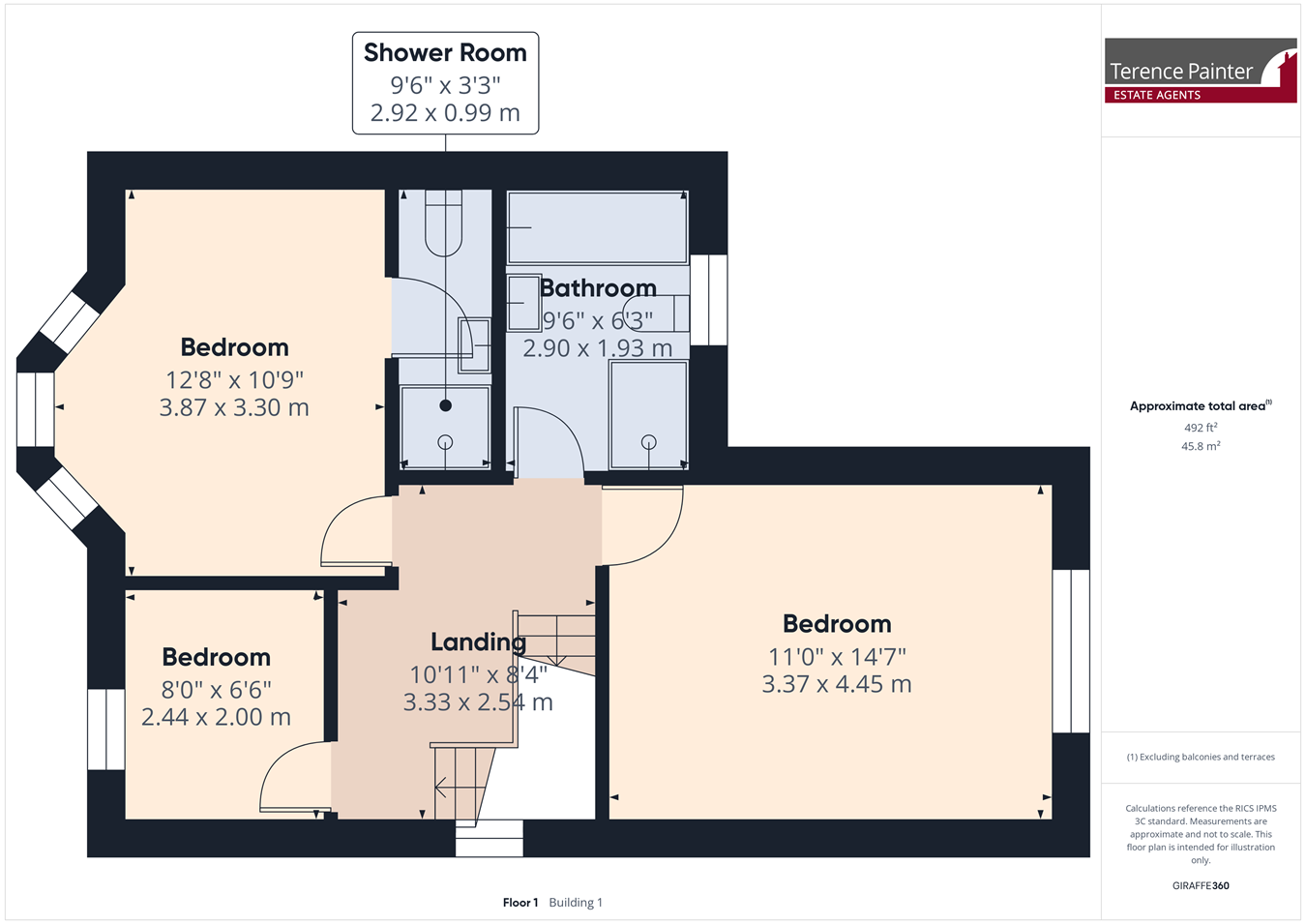 2.92m x 0.99m (9' 7" x 3' 3") This fully tiled room comprises a shower cubicle, pedestal wash hand basin, low level w.c, ladder style towel radiator, extractor, down lights and tiled flooring.