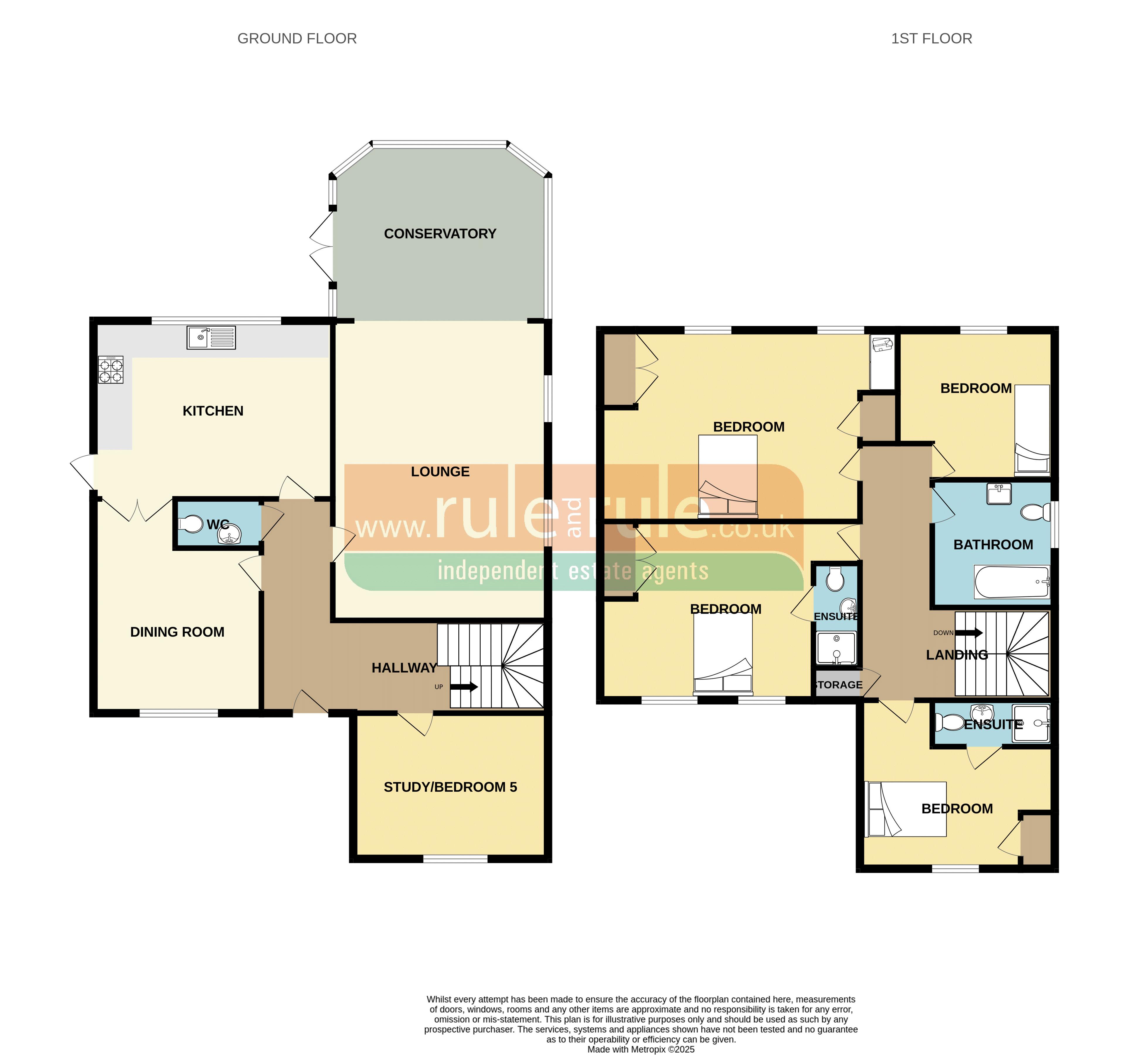 Two of the double bedrooms benefit from modern en-suite bathrooms, while a versatile downstairs study provides the option for a fifth bedroom if required. The living areas are generous and thoughtfully arranged, featuring a large living room, separate kitchen and dining rooms, and a beautifully styled conservatory—ideal for everyday comfort and entertaining alike.