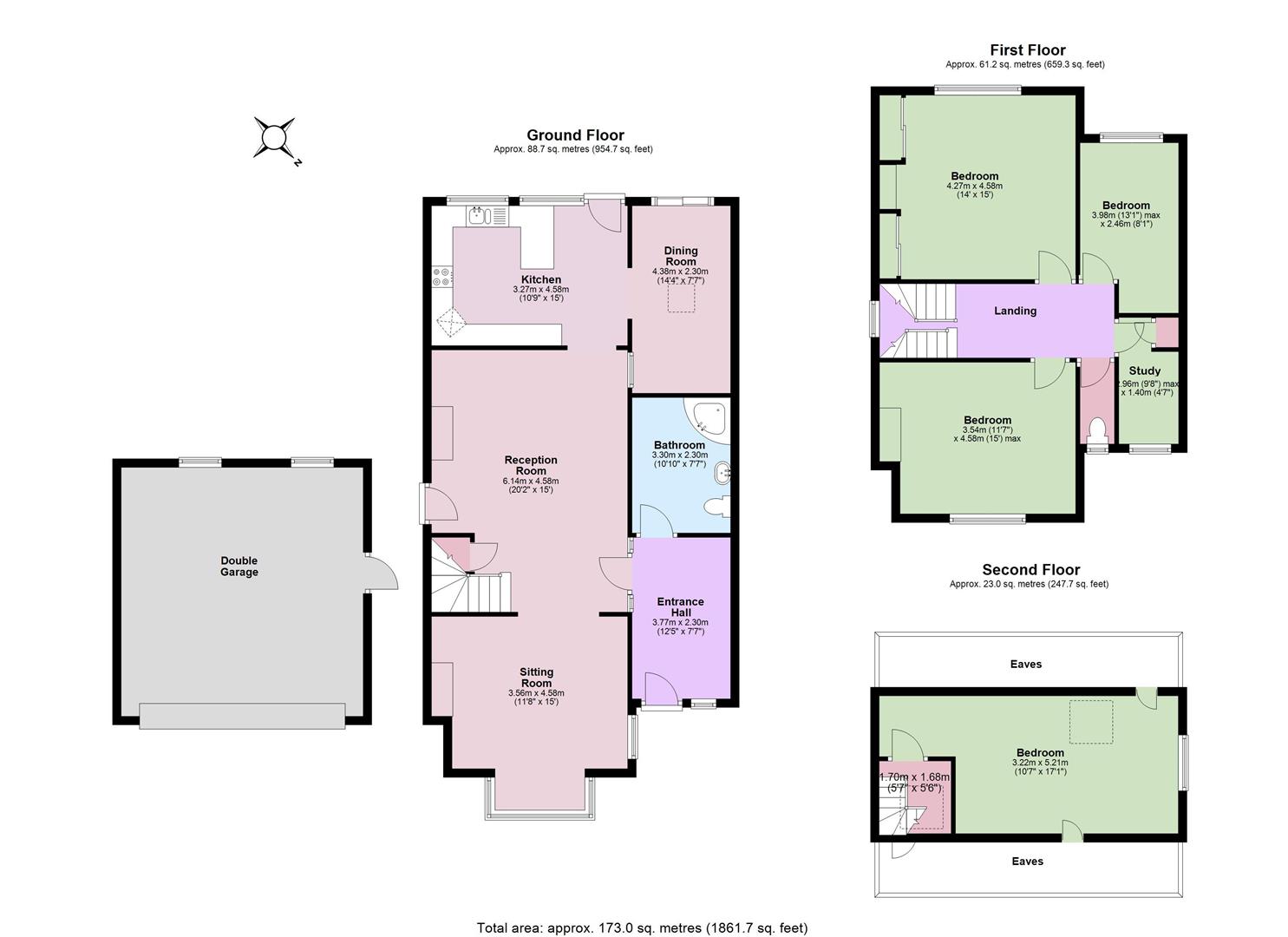 The accommodation includes a large entrance hall, sitting room to the front, reception room, kitchen/breakfast room, dining room and a ground floor bathroom. On the first floor are two good size double bedrooms, a single bedroom, study and separate WC which could potentially be combined to create a first floor bathroom. There are stairs to the top floor occupied by one large loft room/bedroom with eaves storage.