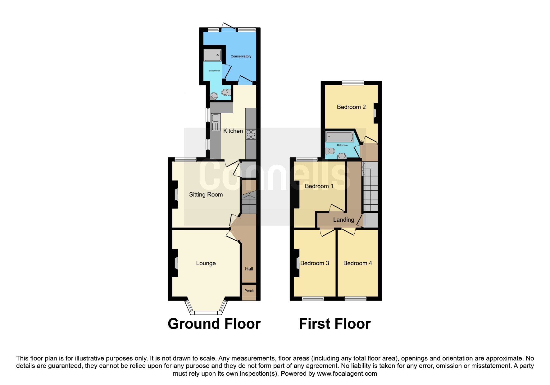The property is spread over two floors with a bay fronted bedroom, living room, kitchen, shower room and conservatory to the ground floor. There are four bedrooms and a main bathroom to the first floor.
