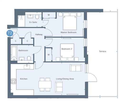 Please refer to the footnote regarding the services and appliances. Room sizes:HallwayLiving/Dining Area/Kitchen: 25'5 x 11'9 (7.75m x 3.58m)TerraceBedroom 1: 14'2 x 8'11 (4.32m x 2.72m)En-Suite Shower RoomBedroom 2: 13'6 x 8'9 (4.12m x 2.67m)BathroomAllocated Parking