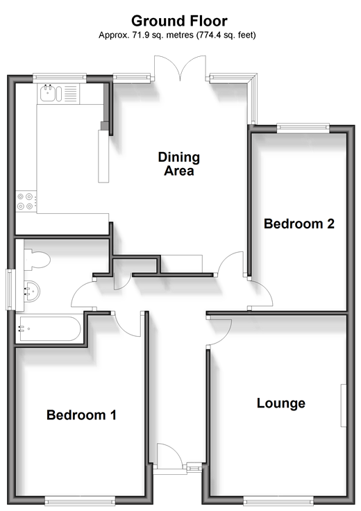 Please refer to the footnote regarding the services and appliances. Room sizes:Entrance HallwayKitchen: 15'2 x 10'4 (4.63m x 3.15m)Dining Area: 11'2 x 6'10 (3.41m x 2.08m)Lounge: 14'0 x 10'6 (4.27m x 3.20m)Bedroom 1: 11'8 x 10'0 (3.56m x 3.05m)Bedroom 2: 13'8 x 7'4 (4.17m x 2.24m)Bathroom: 8'1 x 6'2 (2.47m x 1.88m)Front GardenDrivewayRear Garden