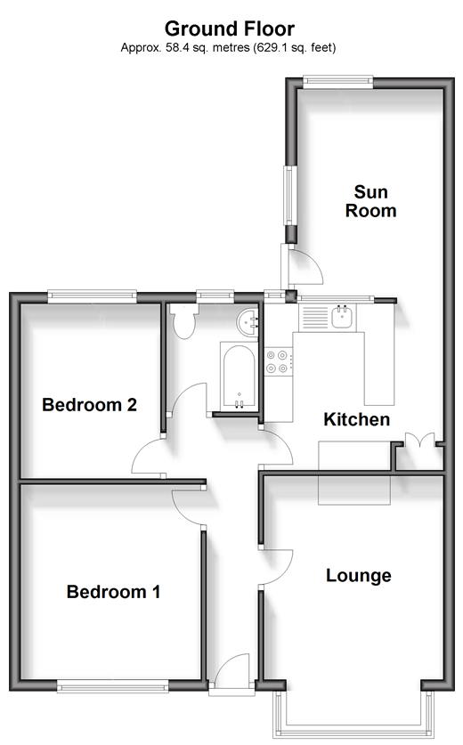 Please refer to the footnote regarding the services and appliances. Room sizes:Entrance HallLounge: 14'2 x 10'3 (4.32m x 3.13m)Bedroom 1: 11'8 x 10'3 (3.56m x 3.13m)Bedroom 2: 10'0 x 7'11 (3.05m x 2.41m)BathroomKitchen: 10'3 x 8'4 (3.13m x 2.54m)Sun Room: 11'11 x 8'3 (3.63m x 2.52m)Driveway for 2+ carsRear Garden