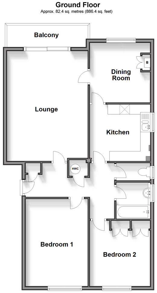 Please refer to the footnote regarding the services and appliances. Room sizes:Entrance HallwayLounge: 18'7 x 13'4 (5.67m x 4.07m)BalconyDining Room: 10'11 x 10'2 (3.33m x 3.10m)Kitchen: 10'6 x 9'3 (3.20m x 2.82m)Separate ToiletBathroom: 5'8 x 5'0 (1.73m x 1.53m)Bedroom 2: 11'2 x 10'10 (3.41m x 3.30m)Bedroom 1: 14'1 x 10'3 (4.30m x 3.13m)Residents ParkingGarage To The Rear