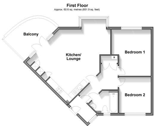 Please refer to the footnote regarding the services and appliances. Room sizes:Entrance HallBathroomBedroom 2: 9'7 x 8'7 (2.92m x 2.62m)Bedroom 1: 12'6 x 10'5 (3.81m x 3.18m)Kitchen/Lounge: 21'6 x 15'10 (6.56m x 4.83m)BalconyAllocated ParkingCommunal Garden