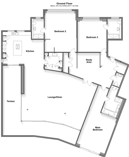 Room sizes:Entrance HallStudy AreaLounge/Diner: 35'1 maximum x 25'0 maximum (10.70m x 7.63m)Kitchen: 20'3 minimum x 16'4 maximum (6.18m x 4.98m)Utility Room: 9'5 x 5'9 (2.87m x 1.75m)CloakroomMain Bedroom: 27'3 maximum x 14'4 maximum (8.31m x 4.37m)En Suite Bath/Shower Room: 17'0 maximum x 7'8 maximum (5.19m x 2.34m)Bedroom 2: 17'3 x 14'4 (5.26m x 4.37m)En Suite Shower RoomBedroom 3: 14'1 maximum x 10'8 maximum (4.30m x 3.25m)En Suite Shower Room: 23'9 maximum x 14'4 maximum (7.24m x 4.37m)OUTSIDETerraceDouble GarageAllocated ParkingCommunal GardensEntrance HallStudy Area