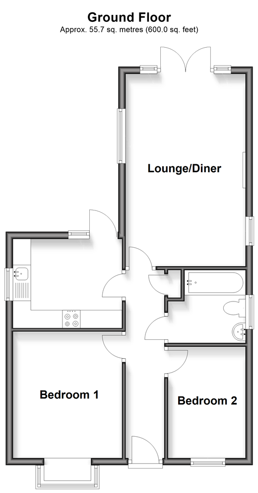 Please refer to the footnote regarding the services and appliances. Room sizes:Entrance hallLounge: 17'9 x 11'9 (5.41m x 3.58m)Kitchen: 10'2 x 8'2 (3.10m x 2.49m)Bedroom 1: 11'5 x 10'4 (3.48m x 3.15m)Bedroom 2: 10'2 x 7'11 (3.10m x 2.41m)BathroomOff road parking