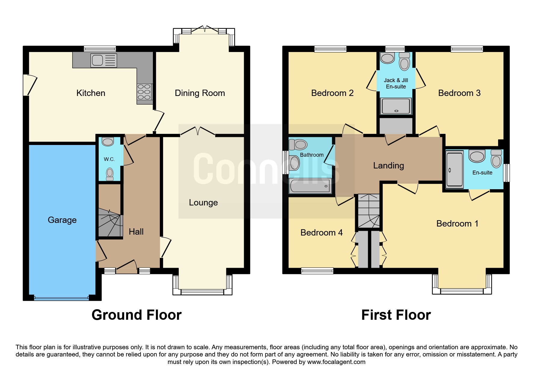 Upstairs, all four bedrooms are generously sized doubles, offering flexibility for families, guests, or home working. The main bedroom benefits from a private en-suite, while bedrooms 2 and 3 share a stylish Jack & Jill en-suite, and a further family bathroom serves the rest of the home.