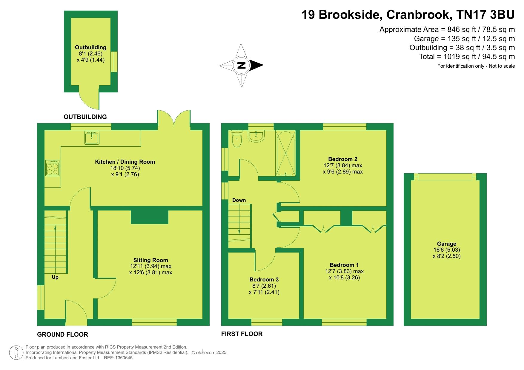 Outside, a concrete pathway with lawned front garden, leads up to the front door and continues round to a side gate. The rear garden is also laid to lawn, fenced and enclosed, with patio area and a useful brick outbuilding for storage. A single garage en bloc within a block of four is situated in the top right-hand corner.