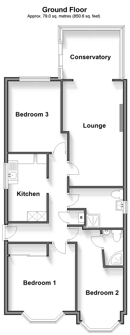 Please refer to the footnote regarding the services and appliances. Room sizes:GROUND FLOORHallwayLounge: 17'5 x 10'3 (5.31m x 3.13m)Conservatory: 9'0 x 7'5 (2.75m x 2.26m)Kitchen: 11'3 x 6'3 (3.43m x 1.91m)BathroomBedroom 1: 11'3 x 11'3 (3.43m x 3.43m)Bedroom 2: 17'5 at widest point x 7'7 (5.31m x 2.31m)En-suite shower: 5'9 x 3'3 (1.75m x 0.99m)Bedroom 3: 11'8 x 8'7 (3.56m x 2.62m)OUTSIDERear GardenDriveway to Front