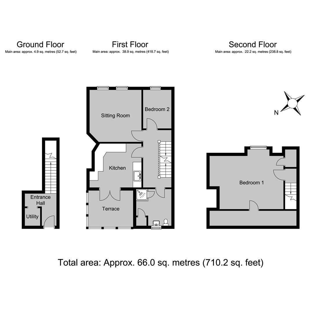 Accessed via its own private ground-floor entrance from Sea Street, the property is arranged over two floors with accommodation comprising an entrance hall with a utility cupboard, a sitting room, a kitchen with casement doors opening onto a large private terrace, two double bedrooms, and a generous shower room.