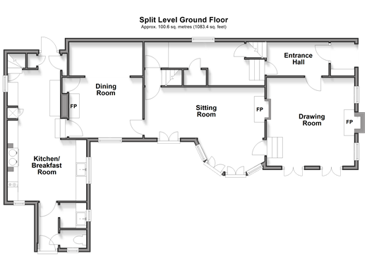 Room sizes:SPLIT LEVEL GROUND FLOORPorchHallDrawing Room: 14'0 x 14'0 (4.27m x 4.27m)Sitting Room: 19'0 (5.80m) x 14'0 (4.27m) narrowing to 13'0 (3.97m)Dining Room: 14'10 x 11'10 (4.52m x 3.61m)Kitchen / Breakfast Room: 24'6 x 11'6 (7.47m x 3.51m)Separate ToiletLandingPrinciple Bedroom: 14'7 x 13'0 (4.45m x 3.97m)En Suite Bath & Shower Room: 10'7 x 8'3 (3.23m x 2.52m)Dressing Room / Bedroom 4: 11'5 x 9'4 (3.48m x 2.85m)Bath / Shower RoomBedroom 2: 12'4 x 10'5 (3.76m x 3.18m)Bedroom 3: 11'5 x 8'5 (3.48m x 2.57m)CloakroomRear GardenFront GardenDrivewayOutside Carport: 20'4 x 17'3 (6.20m x 5.26m)