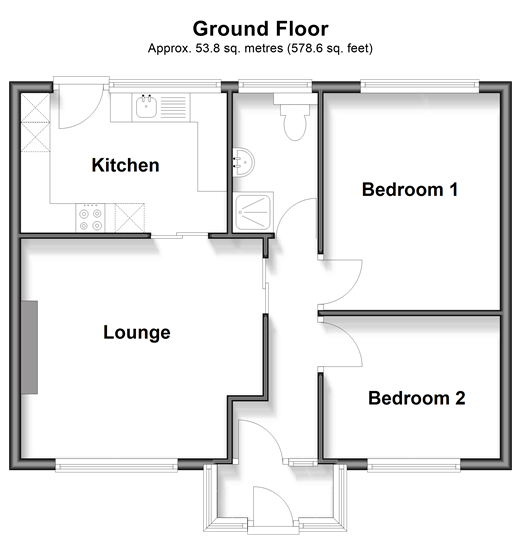 Please refer to the footnote regarding the services and appliances. Room sizes:Entrance PorchEntrance HallLounge: 13'6 x 12'6 (4.12m x 3.81m)Kitchen: 11'6 x 7'8 (3.51m x 2.34m)Bedroom 1: 12'3 x 9'9 (3.74m x 2.97m)Bedroom 2: 9'9 x 8'2 (2.97m x 2.49m)Shower Room: 7'8 x 4'8 (2.34m x 1.42m)Front GardenFront DrivewayRear GardenGarage