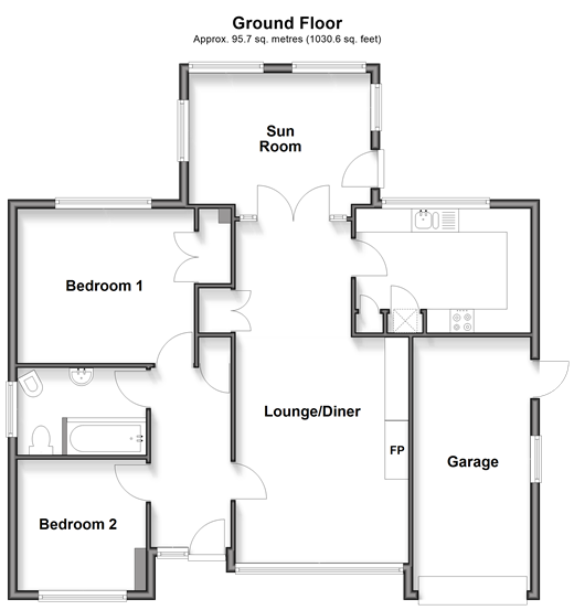 Please refer to the footnote regarding the services and appliances. Room sizes:Entrance Hall: 12'4 x 5'0 (3.76m x 1.53m)Lounge/Diner: 14'5 x 11'11 (4.40m x 3.63m) plus 8'0 x 7'7 (2.44m x 2.31m)Kitchen: 12'1 x 8'1 (3.69m x 2.47m)Bedroom 1: 12'1 x 10'7 (3.69m x 3.23m)Bedroom 2: 8'11 x 8'10 (2.72m x 2.69m)Bathroom: 8'10 x 5'11 (2.69m x 1.80m)Sun Room: 12'8 x 10'0 (3.86m x 3.05m)Workshop: 10'3 x 9'9 (3.13m x 2.97m)Storage: 9'3 x 6'2 (2.82m x 1.88m)GarageDrivewayFront and Rear Gardens