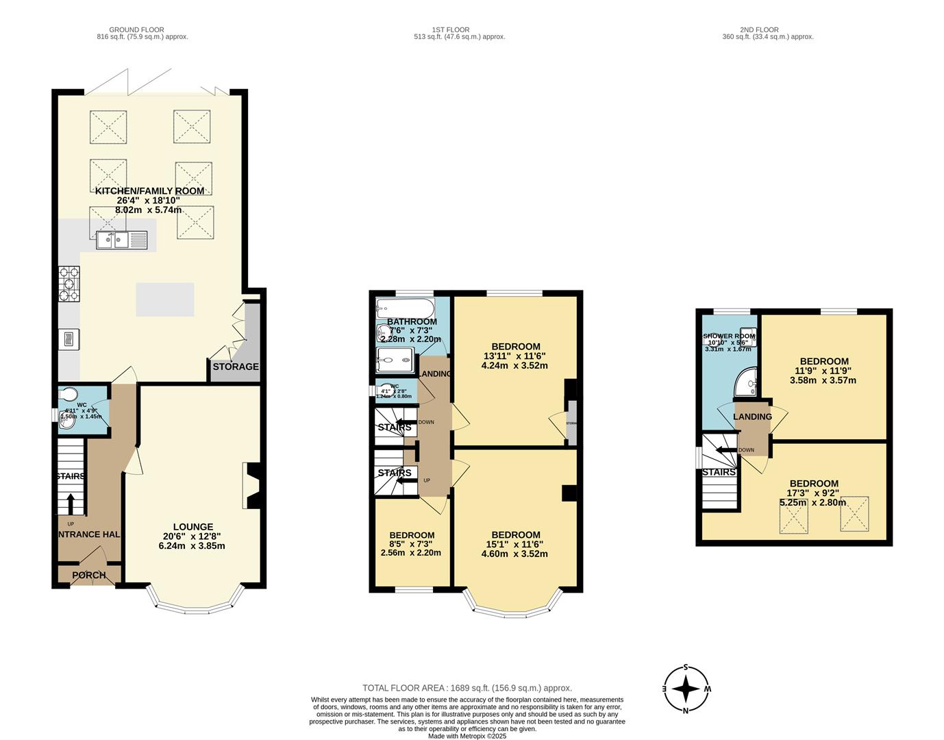 The ground floor features a welcoming lounge, a convenient cloakroom/WC, and an impressive extended kitchen/diner/family room perfect for modern family living and entertaining. On the first floor, you ll find three well-proportioned bedrooms, the family bathroom, and an additional cloakroom/WC. The top floor provides two further bedrooms and a separate shower room, ideal for guests or growing families.