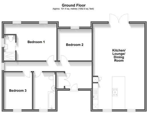Please refer to the footnote regarding the services and appliances. Room sizes:Entrance HallKitchen/Lounge/Dining Room: 27'0 x 16'1 (8.24m x 4.91m)Bathroom: 11'7 x 7'0 (3.53m x 2.14m)Bedroom 1: 16'2 maximum x 11'8 (4.93m x 3.56m)Bedroom 2: 10'6 x 9'11 (3.20m x 3.02m)Bedroom 3: 11'7 x 8'9 (3.53m x 2.67m)Off Road ParkingRear Garden