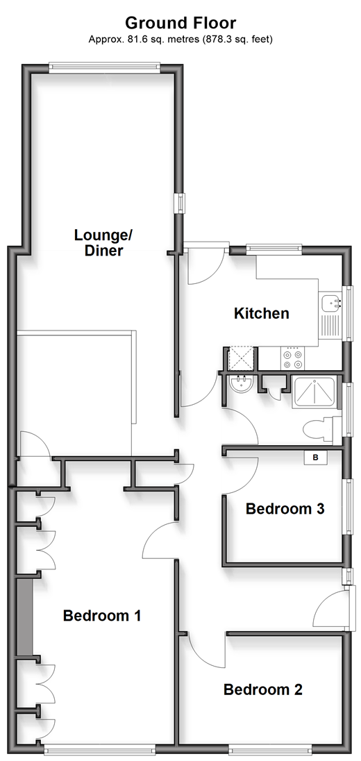 Please refer to the footnote regarding the services and appliances. Room sizes:Entrance HallwayBedroom 2: 11'3 x 7'4 (3.43m x 2.24m)Bedroom 1: 17'4 x 9'6 (5.29m x 2.90m)Bedroom 3: 7'7 x 7'5 (2.31m x 2.26m)Shower Room: 8'0 x 4'7 (2.44m x 1.40m)Kitchen: 11'2 x 8'0 (3.41m x 2.44m)Lounge/Diner: 26'5 x 10'7 (8.06m x 3.23m)GarageFront GardenDrivewayRear Garden