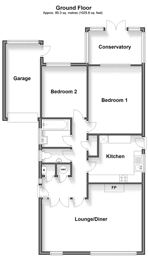 Please refer to the footnote regarding the services and appliances. Room sizes:Entrance HallCloakroomLounge/Diner: 20'0 x 14'1 (6.10m x 4.30m)Kitchen: 11'4 x 9'11 (3.46m x 3.02m)ConservatoryBedroom 1: 10'5 x 3'9 (3.18m x 1.14m)Bedroom 2: 10'9 x 10'3 (3.28m x 3.13m)BathroomGarageDrivewayFront GardenRear Garden