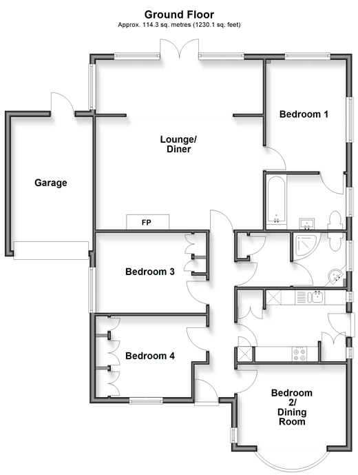 Please refer to the footnote regarding the services and appliances. Room sizes:Entrance HallLounge/Diner: 18'3 x 12'7 (5.57m x 3.84m) plus 18'2 x 6'6 (5.54m x 1.98m)Bedroom 1: 12'0 x 8'9 (3.66m x 2.67m)En-Suite BathroomBedroom 2/Dining Room: 13'3 into bay x 11'3 (4.04m x 3.43m)Bedroom 3: 11'9 x 8'9 (3.58m x 2.67m)Bedroom 4: 10'8 x 8'9 (3.25m x 2.67m)Kitchen: 11'9 x 7'8 (3.58m x 2.34m)Utility RoomShower RoomOff Road ParkingGarageFront & Rear Gardens