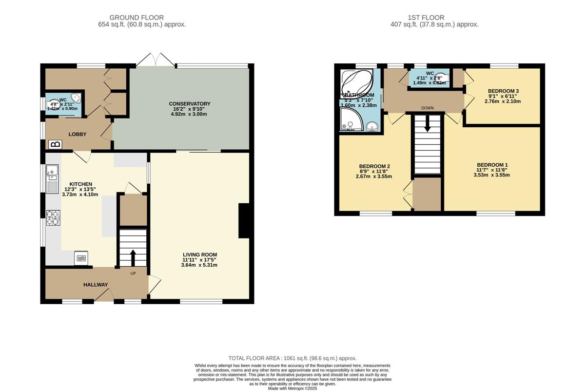 The first floor offers two well-proportioned double bedrooms and a generous single, providing flexible accommodation for families or guests. The family bathroom features a corner bath, step-in shower and basin, complemented by a separate WC for added convenience.