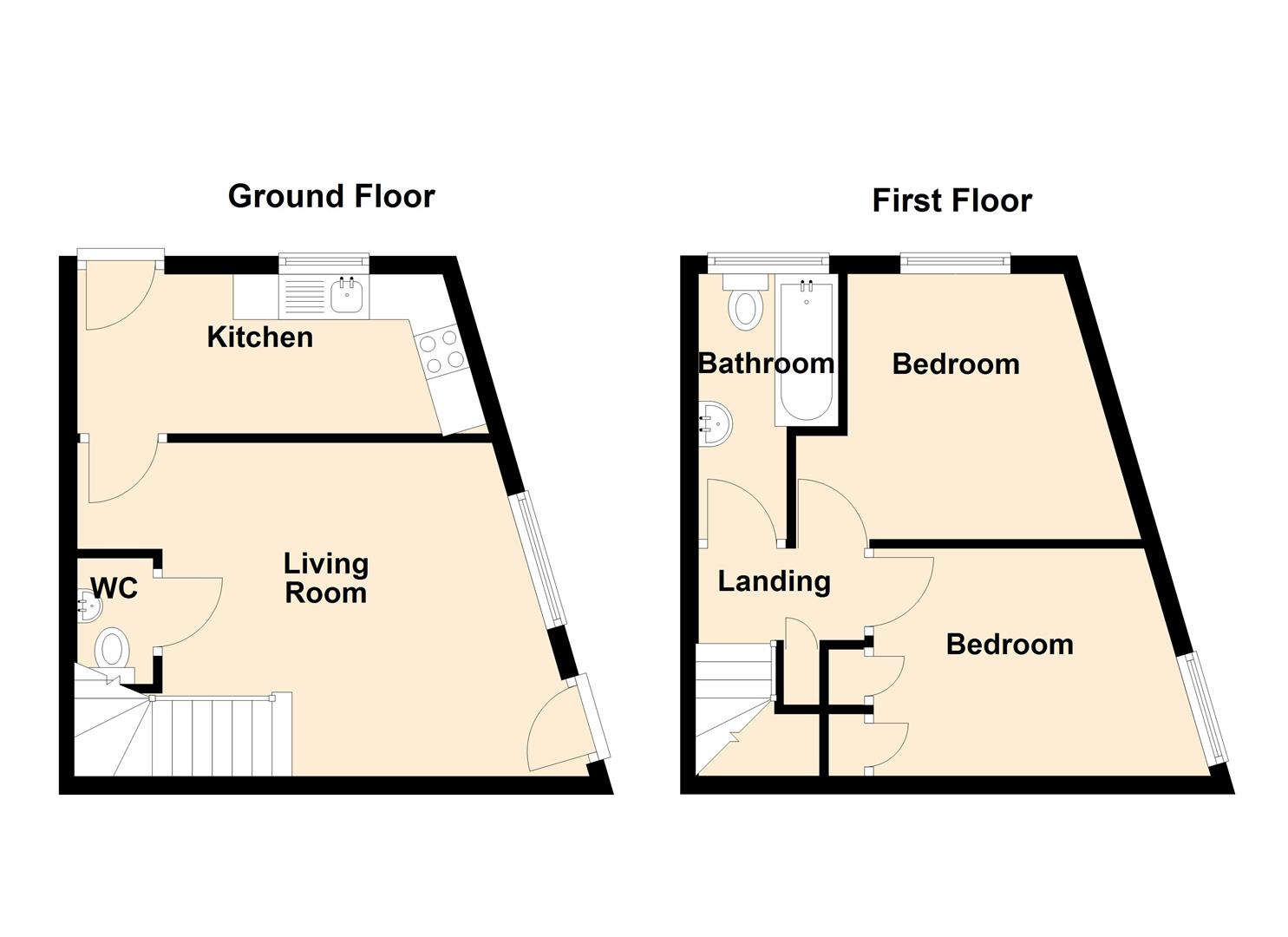 The layout includes a comfortable living room, a cloakroom/WC, and a well-equipped fitted kitchen on the ground floor. The first floor offers two bedrooms and a separate family bathroom.