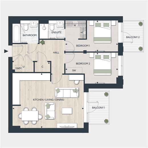 A stunning contemporary 831sqft first floor apartment with balcony. The open plan living space boasts a sleek kitchen with soft close doors, Siemens integrated appliances and Silestone worktops. A private balcony is located just off the living area/dining area both of which are are both spacious and inviting with Amtico wood effect flooring and wiring for Sky Q. The main bedroom benefits from fitted wardrobes, its own private balcony, a dressing area and an impressive ensuite shower room. Bedroom 2 shares a bathroom with the rest of the home. Both comprise striking tiling, white sanitaryware and brushed brass fittings. With allocated parking, a video entry system, 2-year Berkely warranty with their customer service team and a 10-year Premier guarantee, peace of mind is ensured. Part of the Oakhill new homes development. Tucked away in the heart of the countryside, Oakhill resides in Hildenborough, one of Kentâ₼™s best kept secrets. The gated estate is an exquisite collection of apartments and houses set in 30 acres of beautiful parkland. Situated near the vibrant market town of Tonbridge offering wonderful country walks and excellent schools while the enchanting towns of Sevenoaks and Royal Tunbridge Wells are just 6 & 9 miles away, boasting a selection of galleries, theatres and Michelin-starred restaurants. With trains to London Bridge in just 32 minutes from Hildenborough, Oakhill combines the best of contemporary living with a rural escape in the Garden of England. *Images are computer generated or of the show home for illustrative purposes only, finishes and layouts may vary. Room sizes:Kitchen/Living/Dining: 20'7 x 16'1 (6.28m x 4.91m)HallwayBedroom 1: 15'5 x 9'0 (4.70m x 2.75m)En suiteBedroom 2: 15'5 x 9'2 (4.70m x 2.80m)BathroomLiving Area BalconyBedroom 1 BalconyAllocated Parking