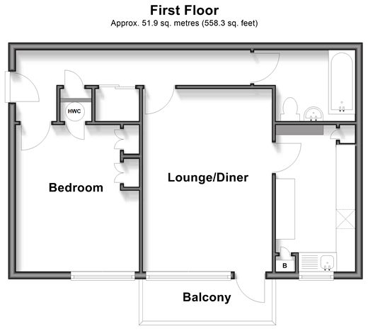 Please refer to the footnote regarding the services and appliances. Room sizes:HallwayLounge/Diner: 16'10 x 10'4 (5.13m x 3.15m)BalconyKitchen: 13'2 x 6'10 (4.02m x 2.08m)Bedroom: 12'11 x 10'7 (3.94m x 3.23m)Bathroom: 8'10 x 6'2 (2.69m x 1.88m)