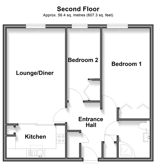 Please refer to the footnote regarding the services and appliances. Room sizes:Entrance HallLounge/Diner: 17'2 x 10'2 (5.24m x 3.10m)Kitchen: 10'5 x 5'11 (3.18m x 1.80m)Bedroom 1: 14'4 x 8'7 (4.37m x 2.62m)Bedroom 2: 13'10 maximum x 5'11 (4.22m x 1.80m)Shower RoomCommunal Gardens