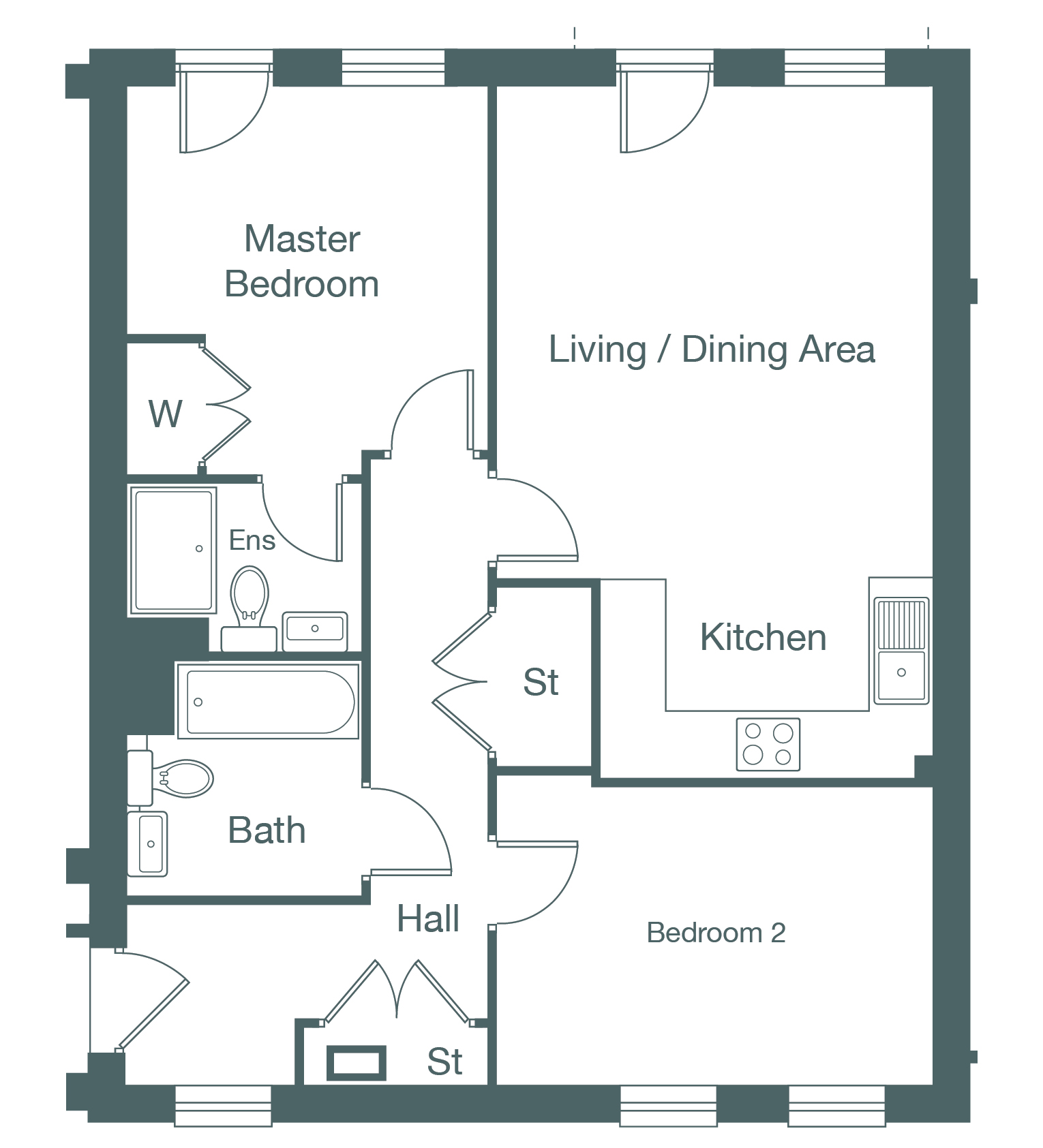 The Kensham's accommodation consists of a large open plan living room/dining room/kitchen, kitchen comes well-appointed with white goods included. Second bedroom is a good size with fantastic light coming into the room with two windows. The Master suite includes a wardrobe and en-suite bathroom. The property also benefits from a family bathroom and two large storage cupboards. The property has extremely good head heights throughout.