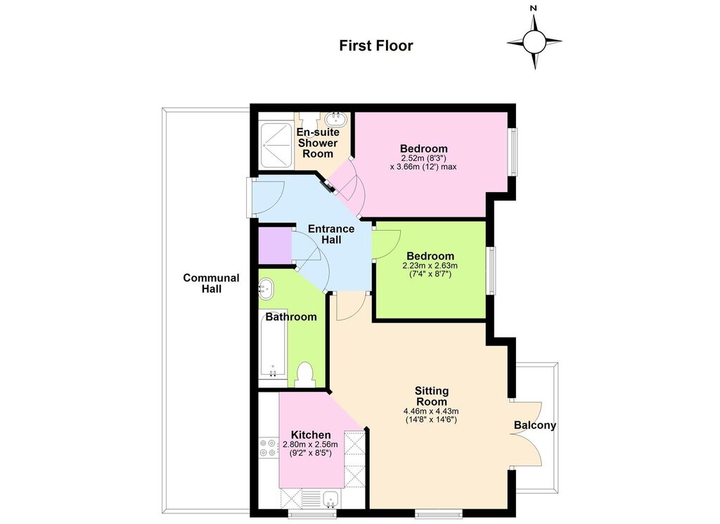 The apartment offers two well-proportioned bedrooms, with the master featuring its own modern en-suite shower room. A separate family bathroom, finished in a contemporary style, completes the internal accommodation.