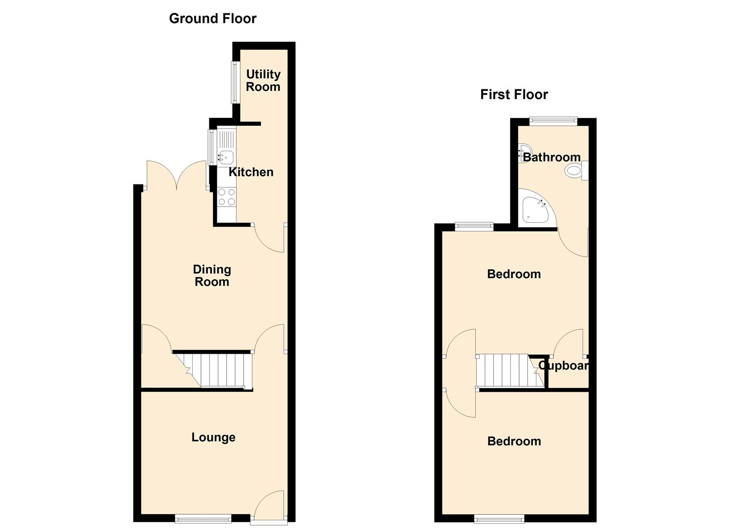 The ground floor features a welcoming lounge, a separate dining area, a fitted kitchen, and a useful utility area. Upstairs, there are two double bedrooms and a first-floor bathroom (accessed via the rear bedroom).