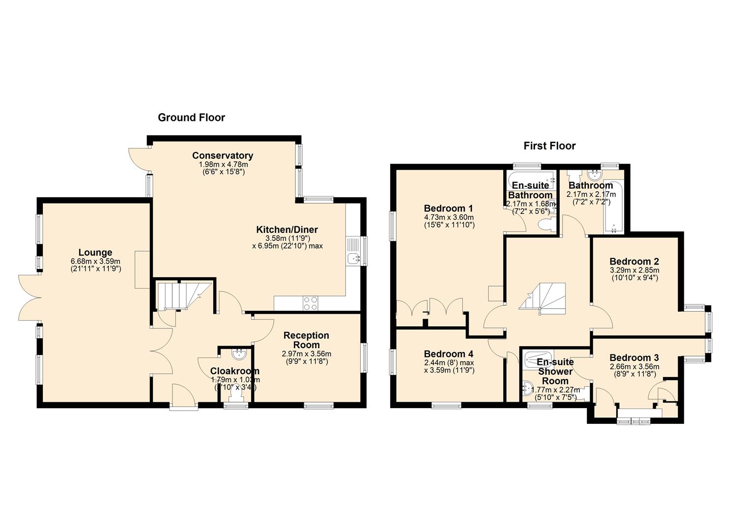 On the first floor are four well sized bedrooms. one with en-suite bathroom, the other with en-suite shower room, a separate family bathroom for the other two bedrooms use.