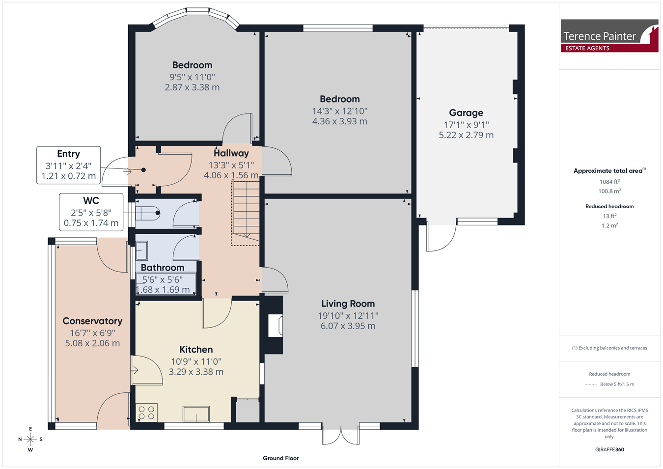 The ground floor comprises an L-shaped entrance hall, a double-aspect living room with access to the garden, kitchen, conservatory, two double bedrooms, a bathroom, and a separate WC. To the first floor is the third bedroom, which benefits from a large dormer window offering distant sea views, along with access to a dressing room.