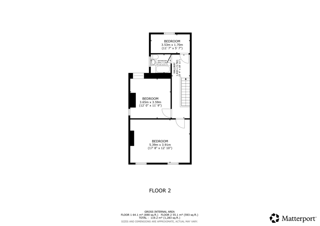 Upstairs, the first floor offers three well-proportioned bedrooms. The master bedroom is an exceptionally large double, providing ample space for furnishings and storage. The second bedroom is also a comfortable double, while the third is a spacious single, ideal for a child’s room, guest space, or home office. A modern family bathroom serves all three bedrooms.