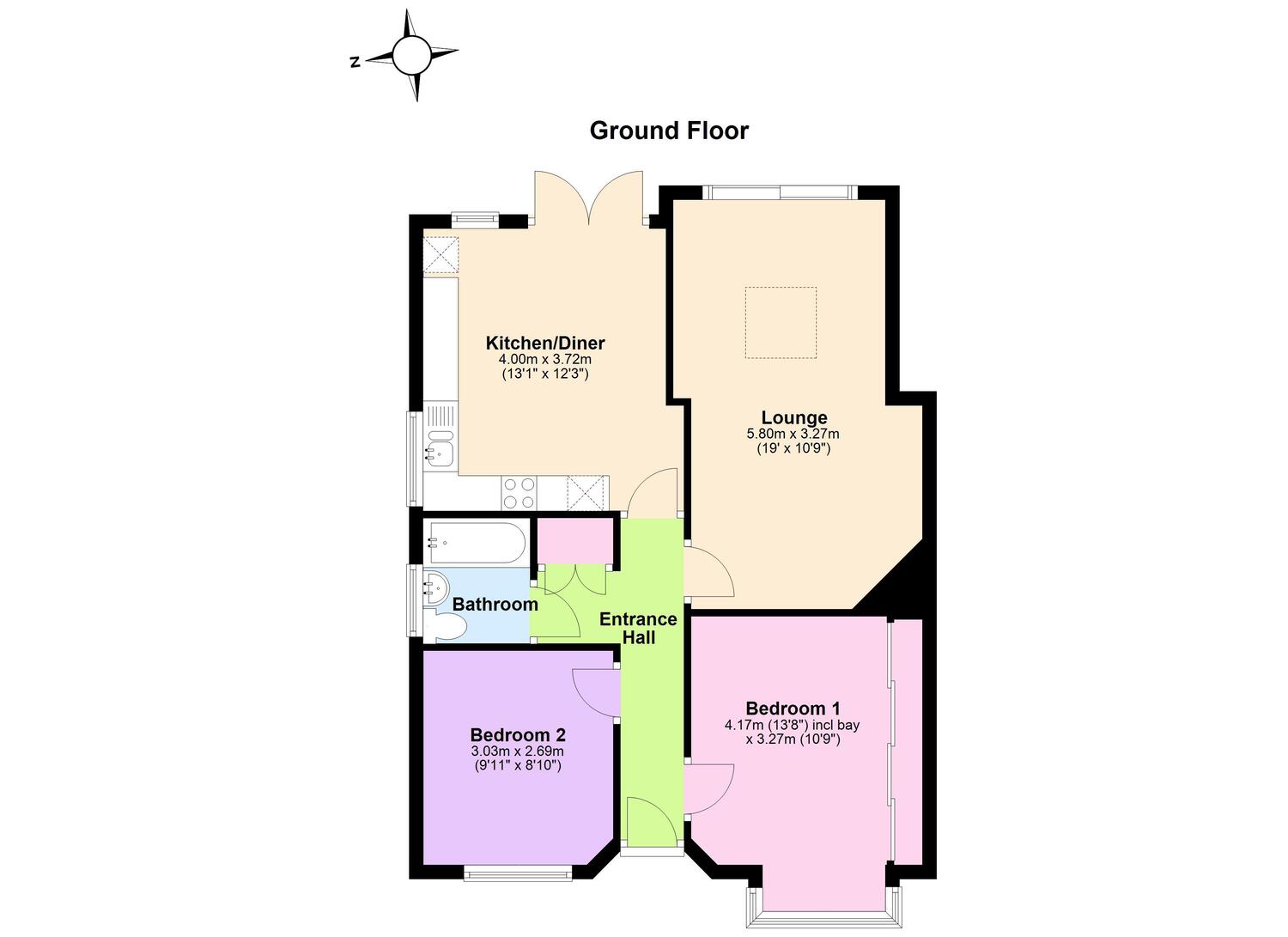 Once inside, a welcoming hallway leads to all principal rooms. The two bedrooms are positioned to the front of the property, with the master bedroom featuring a charming bay window that fills the room with natural light. A modern bathroom sits centrally and includes a contemporary white suite with a walk-in bath, ideal for ease of access.