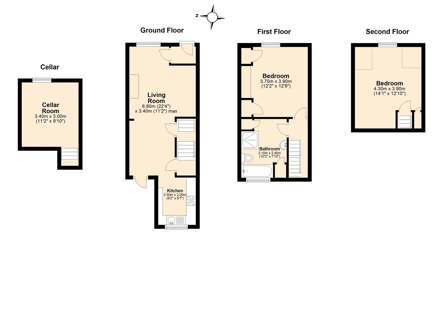 An unfurnished 2 bedroom house situated in a residential location just 300m walk from the town centre. The property boasts an open plan living-dining room and kitchen on the ground floor, main bedroom and bathroom on the first floor, a further double bedroom on the top floor as well as a useful basement room.